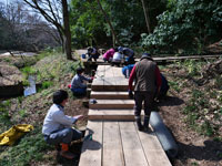 - ボランティアのみなさまとの園内管理作業で木道のメンテナンスを実施。新しくなった木道の一部に滑り止めの金網を張りました(写真)。あわせて、従来からある部分の傷みを補修し、改修工事の際に出た古い木材でベンチを作成! 園内に新たに設置します。ご協力ありがとうございました。