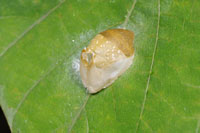 - 昨日見つけたウラギンシジミの蛹。翅の部分が白っぽかったので、あと2、3日で羽化するかなあ、と思っていました。今朝、見に行くと色味が変わっていたので、これは羽化の兆候? と思いよくよく見ると…。背中に穴が空いており、すでに羽化し終わっていました(写真)。予想以上に早かったなあ。