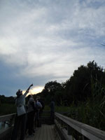 - 「夏の夕暮れ観察会」を開催(写真)。昼と夜の狭間の生きものたちの様子を観察しました。ショウリョウバッタやモンシロチョウなど、昼間に活動する昆虫たちが葉の隙間や裏にとまってじっとしていた一方…。ギンヤンマなど大型のトンボ類が、虫を捕えようと活発に飛び回る様子が見られました。林に響くセミの鳴き声も、ニイニイゼミから時間が進むにつれてヒグラシが増えてゆき…。夕空を背景に、ねぐらへと群れをなして飛んでゆくハシブトガラスたちも見られました。