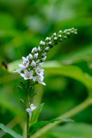 - ふた月ほど前にハンゲショウが見ごろとなっていた桜土手の下の湿地で、ヌマトラノオが咲きました(写真)。公園では数年ぶりの開花です。オカトラノオやノジトラノオと異なり、花序(かじょ)が垂れ下がらず、茎には毛がありません。なお、雨のあとは観察エリアでぬかるみや冠水が発生する可能性がありますのでご注意下さい。