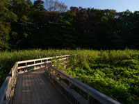 - 最高気温36℃とまだまだ厳しい残暑が続きますが、日が暮れるのが早くなったと感じました(写真)。八ツ橋や木道沿いの開けた場所では、夕方に縄張りを作るルリタテハのオスが、翅を広げて見張りをしていました。