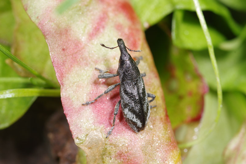 - 午前中、まだ気温が上がる前でしたが、スイバの葉上にハスジカツオゾウムシ(写真)がとまっていました。公園内でよく見られるカツオゾウムシより一回り大型で、体長は14mm。上翅に逆ハの字型の模様があり、幼虫はキク科植物の茎を食します。カツオゾウムシの名の由来は粉をふいた鰹節に似ているためですが、削り節が一般的な昨今では、もはや死語になりつつあるのでしょう。