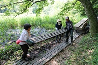 - ボランティアのみなさまとの園内管理作業で、標柱2番近くの園路の補修を行いました(写真)。また、標柱6〜8番間の簡易木道の傷んでいる部分を入れ替えました。おかげさまで、ホタルシーズンに向け園路の安全性が高まりました。作業の途中、なが〜い脚と奇妙なポーズのシャチホコガの幼虫や、湿地で咲き始めたノカンゾウを観察。蒸し暑い中、ご協力ありがとうございました!