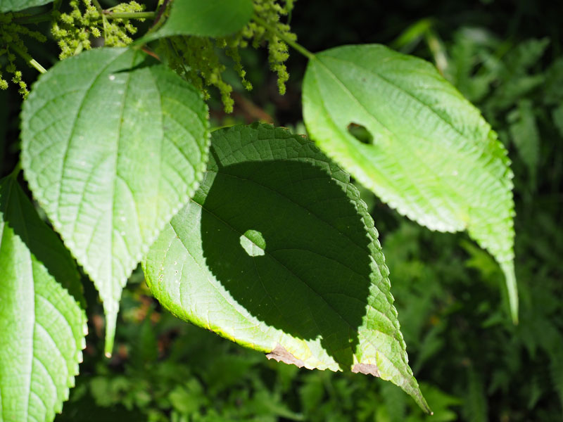 - 青空と黒雲が交互に広がり、小雨もパラつく変わりやすい天気でした。巡視の終盤、一気に晴れて光がさすと、カラムシの葉がくっきりとした影を落としていました(写真)。