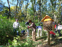 - リンテック株式会社伊奈テクノロジーセンターのみなさんが「生物多様性の保全活動」のために来園しました(写真)。大人の方にご協力頂いたのは、スミレ類など明るい雑木林に生育する植物のためのササ刈り。子どもたちには、ササの稈(かん)をノコギリで細かく切って「ハチ宿」作りのお手伝いをしてもらいました。屋根の下に最後に稈を入れたら完成! 来年の春以降、花や虫たちであふれる林になるように期待を込めて作業を進めました。ご協力ありがとうございました。