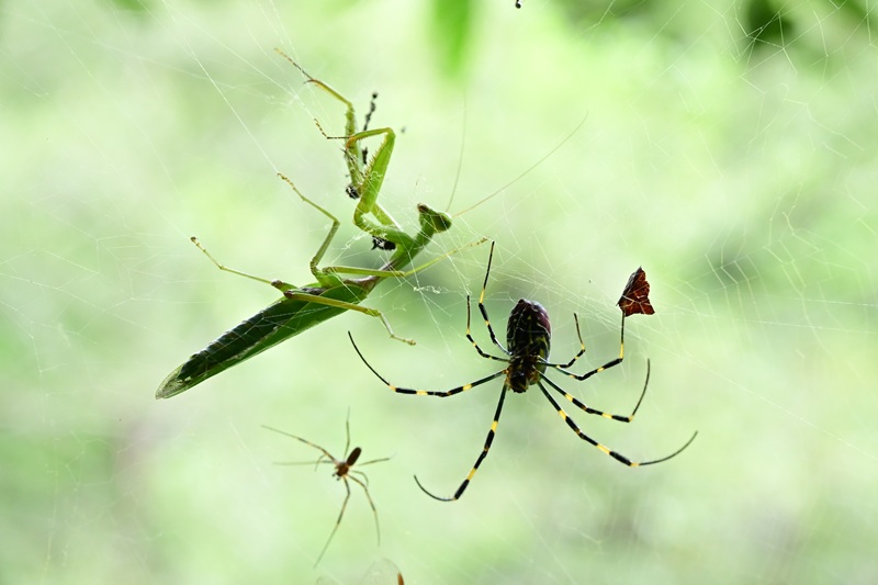 - 一夜堤を巡視中、驚きの光景を目にしました。なんと、ジョロウグモの網に成虫のムネアカハラビロカマキリがかかっていたのです!(写真)上から落っこちてきたのか、飛んでいる途中で絡まったのか、その経緯は謎。これまでにもムネアカハラビロカマキリが何かを狙ったり、逆に狙われたりする場面を何度か目にしてきましたが、今回の肉食のむし対決は在来種に軍配が上がったようです。