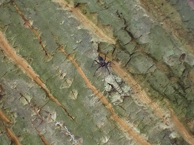 - 標柱2番のスダジイの幹にキノカワガが止まっているのに気付きました。巧みな擬態を見破る事ができて嬉しくなりましたが、写真を撮ろうと近くで見ると、なんとヨコヅナサシガメが口の針を突き刺して捕食している最中でした(写真)。先を越された! と思いつつも、獲物を見つけて忍び寄り、気づかれぬ間に捕らえる。英語でアサシンバグ(暗殺者の虫)と呼ばれている理由がよくわかりました。