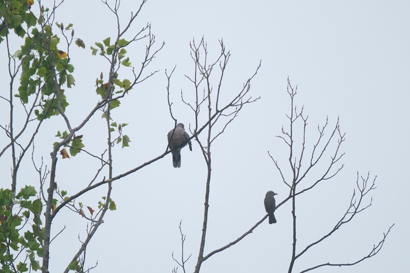 - 小糠雨降る静かな連休初日。ジョロウグモやナガコガネグモの巣は水滴をまとい、ガラスビーズをくっつけたようでした。ふれあい橋から見上げた木の枝先にはキジバトとヒヨドリが止まっていて、時おり羽をふるわせては、雨のしずくを払い落としていました(写真)。