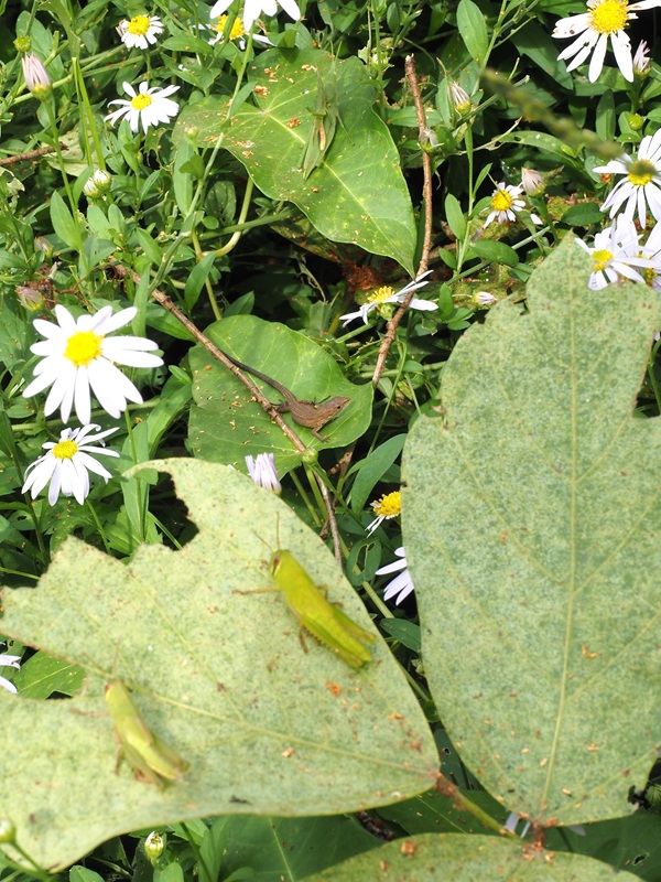 - 南口付近で、日向ぼっこ中のニホンカナヘビを見つけました。野菊の花に囲まれ、さらに乗っているのがハート形のガガイモの葉っぱとあっては、「こ〜れは、かわいさ倍増なのでは!?」とスタッフが写真を撮りたくなるのも無理からぬ話でしょう。そっと近づいてから改めて周りをよくよく見ると、近くに2匹のツチイナゴ、さらにはオンブバッタが止まっているのに気が付きました(写真)。さながら、草むらの生きものたちの休憩スポットです。