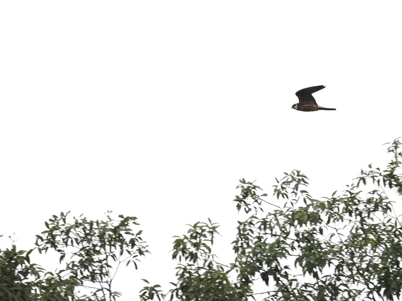 - お昼過ぎに来園者の方からいただいた情報をもとに標柱10番へと向かい、湿地の向こう側の林を双眼鏡で探索すると…いました! チゴハヤブサです。枯れ木に止まっていましたが、カケスにちょっかいを出されて飛び立ちました(写真)。数日前、テレビの自然番組で特集されたばかりの鳥なので、あまりにもタイムリーな出会いに驚嘆。主に北海道〜東北地方で繁殖する夏鳥で、公園では渡りの途中にごく稀に見られます。同じ仲間のハヤブサやチョウゲンボウよりも翼がより鋭く長いのが特徴です。