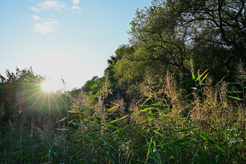 - 数日ぶりに清々しい青空が広がりました(写真)。めだかのT字路の草やぶの上では、コバネイナゴやツチイナゴ、キタテハなどの昆虫たちが日光浴。そして、そんな隙を狙うオオカマキリがあちらこちらで見られました。