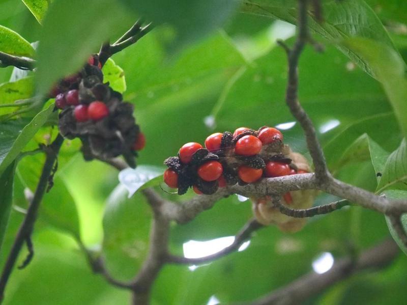 - 秋の最後の節気である「霜降」を迎え、朝晩の冷え込みが増してきました。湿地のツルマメやヤマノイモが黄葉し、各所のノイバラやコマユミの実は濃い朱色に。写真は標柱5〜6番間のコブシの実です(写真)。葉が重なって見えづらいところもあったので定かではありませんが、名前の由来となった握りこぶしのようなカタマリが、枝先にあわせて数十個ほどついているようでした。早春に咲く花の時期が終わると忘れ去られがちですが、秋の実にもぜひご注目を!