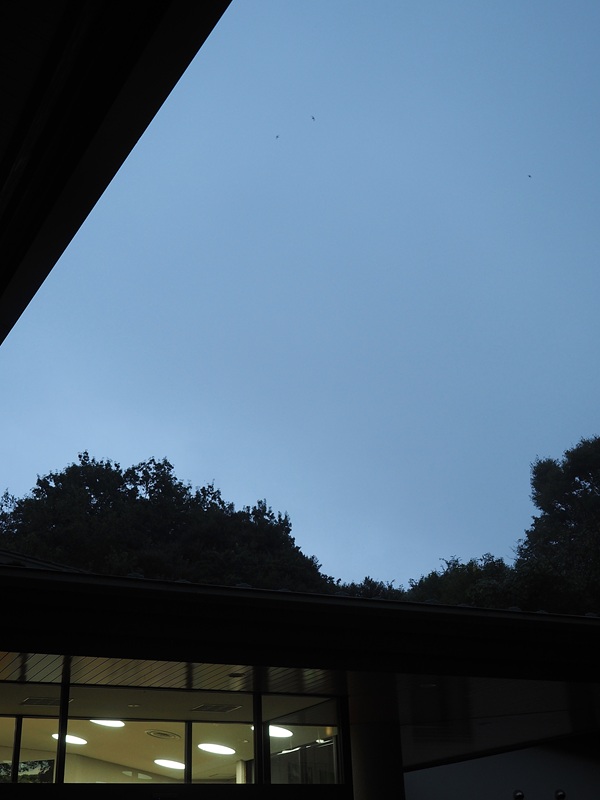 - 夕方、事務室の窓から冷気が入ってきたので「寒い…閉めよう…」と近づいて外を見ると、上空を無数のアマツバメが飛び交っていました(写真)。その数は十数羽。越冬地に向かう途中です。姿はよく似ていますがツバメとは全く別のグループ。巣の材料をとりに地面に下りたり、電線に止まったりすることも多いツバメに対して、アマツバメは巣材集めも交尾も、さらには睡眠も飛びながら行うというのですから驚きです! 乱舞はほんの10分ほどで幕引き、間もなく日没となりました。