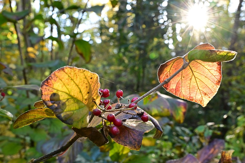 - 林沿いのあちらこちらで、色付いた木の実が目にとまるようになってきました。標柱5〜6番間には、葉の陰に赤い実をつけたヤブコウジや、紅葉とあわせて見ごろを迎えたガマズミ(写真)。さらに標柱15番の近くでは、サネカズラのつやつやの集合果が見られました。また、標柱5番付近ではジャノヒゲの実も青くなり始めました。