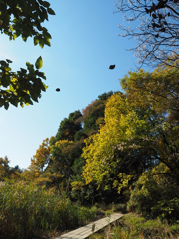 - 強い風が吹き、雑木林の木々がざわざわと音を立てていました。それでも昼頃には気温20℃を超え、陽だまりはぽかぽかと暖か。標柱4〜5番のイヌザクラの幹には日光浴をするアカタテハ。標柱7番〜南口間では、野菊で吸蜜するイチモンジセセリやベニシジミが見られました。また、各所の園路脇で何度も出会ったのはニホンカナヘビ。もうそろそろ冬眠に入ります。