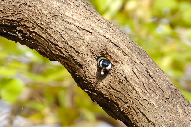 - 掃いても掃いてもたまってゆく落ち葉の対応に、連日追われているスタッフ。でもこれは、見通しが良くなり野鳥が探しやすくなってきた証でもあります。今日は公園全体で31種が観察できました。本格的な冬を前に、みんな頑張って食べもの探し。ハシブトガラスは細い枝先のムクノキの実を器用についばみ、ヤマガラは地面に落ちたエゴノキの実を次々に発見! 標柱16番の雑木林にいた混群の中のシジュウカラは、木の洞の中にシュポッと入っていったかと思うと、虫をくわえて出てきました(写真)。