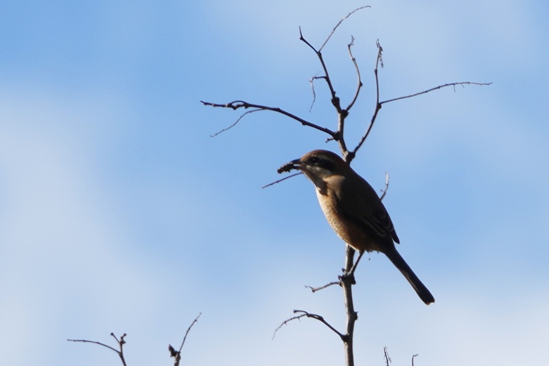 - 「いったいどこで捕まえたの?」と聞きたくなるくらい、丸々としたイモムシのような虫をくわえて飛ぶモズに遭遇! ふれあい橋付近のハリエンジュの木の枝先に止まったところ(写真をクリック)をじっと観察すると…思ったとおり。作業開始から30秒足らずではやにえが完成しました。