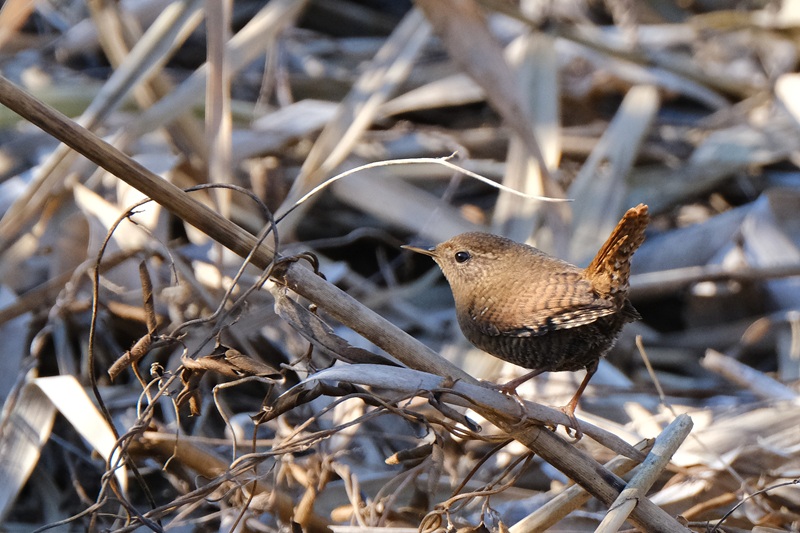 - 昨日に続いて各所の池で全面結氷。キセキレイは氷上を行ったり来たり。ミソサザイ(写真)は近くのヨシの茂みから出入りを繰り返していました。一方、凍らなかった一夜堤の水辺ではカルガモの群れがゆったりと泳ぎ、オニグルミの枝ではカワセミが獲物を探して水面を見つめていました。日によっても、時間帯によっても状態が変化するこの時期の水辺は、見られる鳥の種類や行動が変化に富んでいて面白いなあ、と思います。