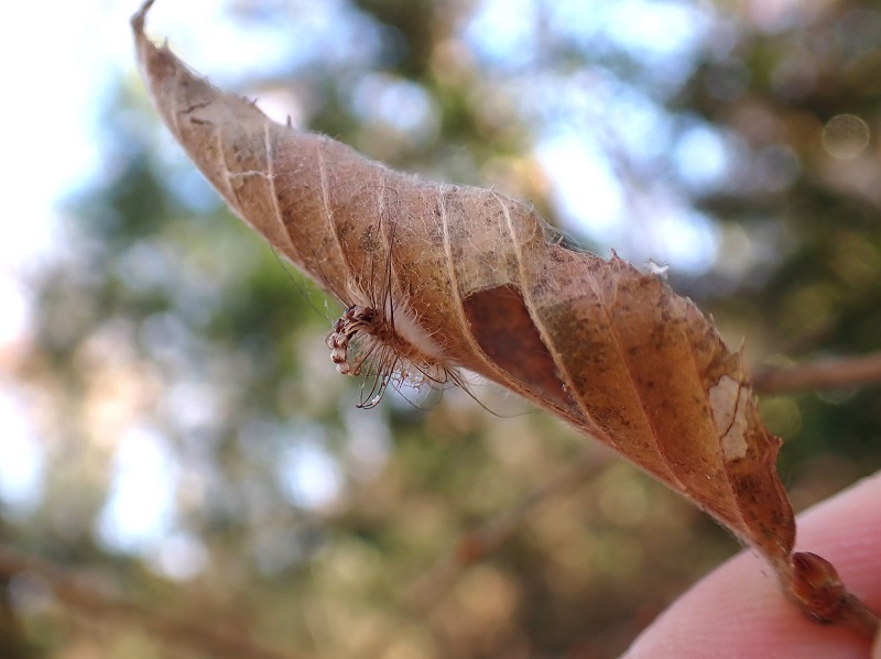 - 標柱12番の林沿いの枝に引っ掛かっていた落ち葉。そこに付いていた何か。最初は虫が反り返っているように見えましたが、正体はリンゴコブガの幼虫でした(写真)。本来この時期は繭になっているはずなので、おそらくは菌によって繭になる前に命を終えたのだと思われます。脱皮をするたびに、自分の頭部の上に頭部の殻を積み上げるという、変わった習性を持ったケムシです。