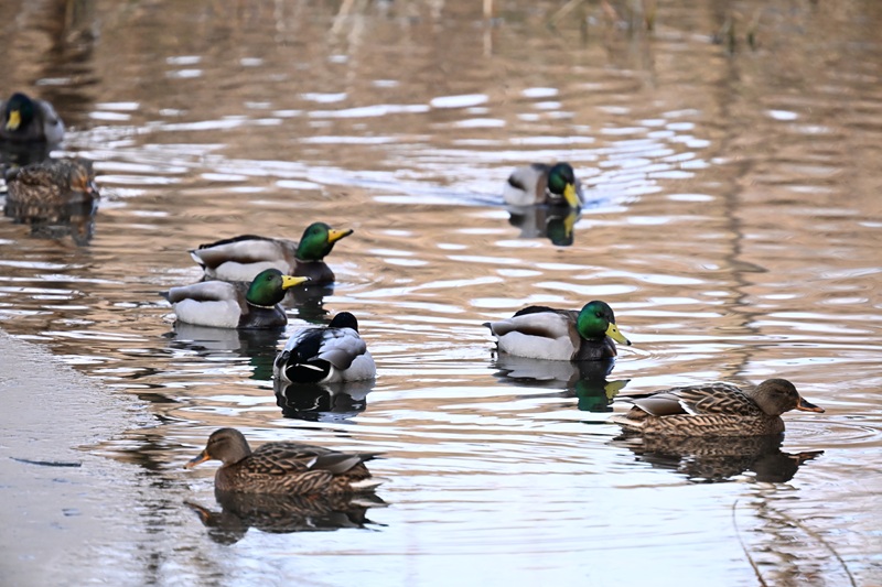 - 八ツ橋の池の氷が半分ほど溶け、マガモが戻ってきました(写真)。また、橋周辺の湿地ではジョウビタキやセグロセキレイ、ハクセキレイが食べものを探していました。さて、今夜は雪の予報。明日にはどんな風景に変わっているでしょうか。