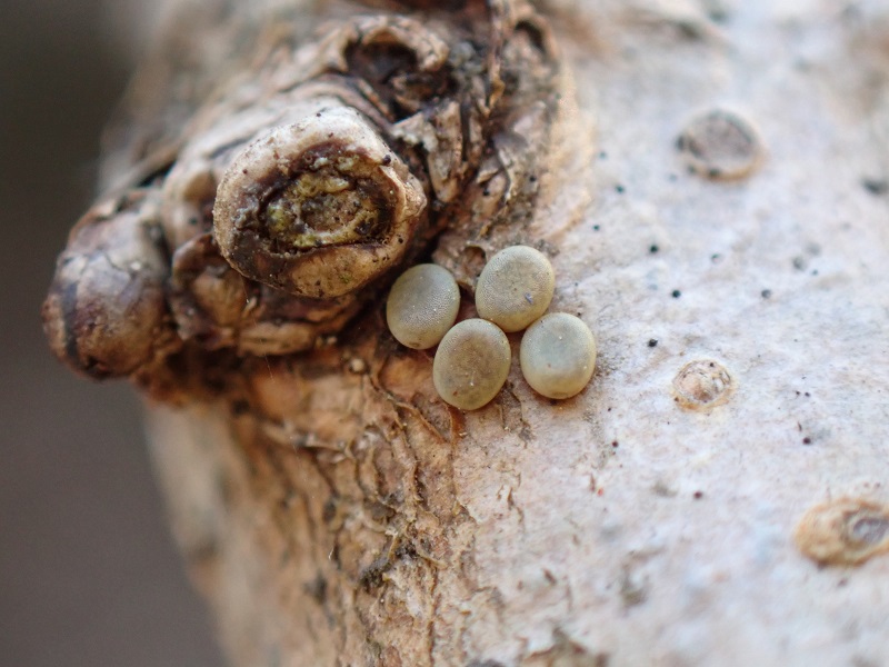 - インターンの学生さんと巡視中に、標柱1番付近のクワの木でクワコの繭がらを観察しました。「そういえば、繭がらはあるけど越冬している卵は見つけたことがないなあ」とスタッフがつぶやいたのをきっかけに、一緒に探してみることに。しばらくしてあきらめかけていた時「それらしきものがあります!」と学生さんが指さす枝に目を向けると、なんと4個の卵!(写真) お手柄です。カイコと同じように、楕円形の卵で中央が少しくぼんでいるのが特徴です。