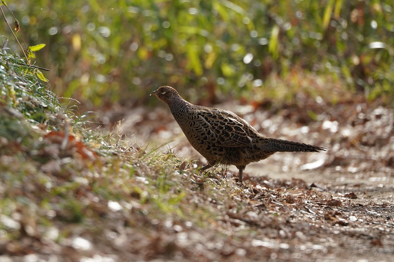 - 標柱12〜13番間を歩いていると、道の奥の方に出てきたのはキジのメス。普段は草やぶの中にいるため、全身が観察できる機会はなかなかありません。驚かせないよう、慎重にカメラを構えてパチリ(写真)。さらに嬉しいことに、センター裏の湿地では、連日鳴き声しか確認できなかったクイナやヒクイナがヨシの間からちらり。バンも約半月ぶりに姿を見せてくれました。