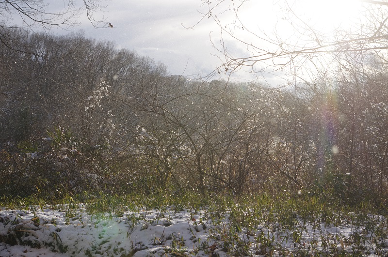 - 気温が急降下。手袋をしていても手がかじかむ寒さでした。風に流れる粉雪にまじって、トネアザミとコウヤボウキの白い綿毛も飛んでいました。