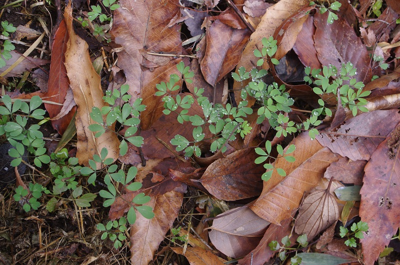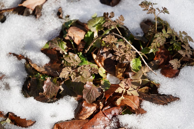 - 雪どけのおかげで、湿地が少しだけ潤いました。足元を見ると、春を待つムラサキケマンの葉が雪から顔をのぞかせ(写真)、萌黄色のケキツネノボタンの株が所々で目立ち始めていました。
