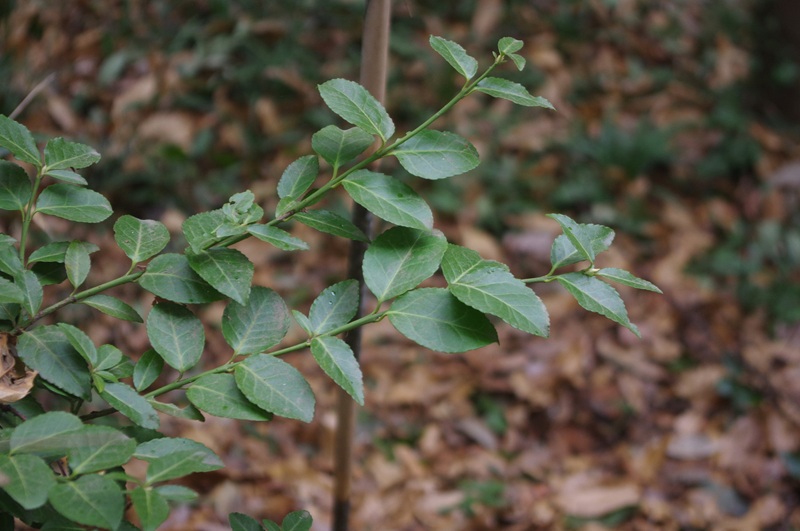 - 標柱9〜10番間の道沿いの土留め杭に絡まるように生えていたのは、常緑でつる性の樹木、ツルマサキ(写真)。葉は生垣として利用されるマサキによく似ています。公園内ではあまり目立たない植物で今まで見過ごしていましたが、大地の乾きに負けず青々とした葉を茂らせる様子に、今日はなんだか惹きつけられました。