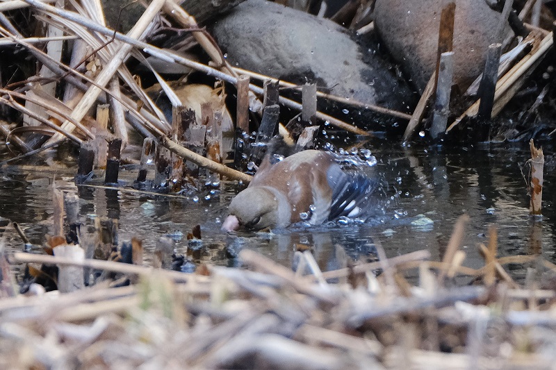 - 標柱4番〜めだかのT字路に向かう園路から見える高尾の池の堰。ここは浅い水場になっていて、最近はアオジやツグミが水浴びや水を飲みにやってきていました。さて、今日は誰がいるかな? と見てみると、水飛沫をあげていたのは1羽のシメ(写真)。連続撮影をすると、仰向け!? と目を疑ってしまうほど首を回した瞬間も写っていました。
