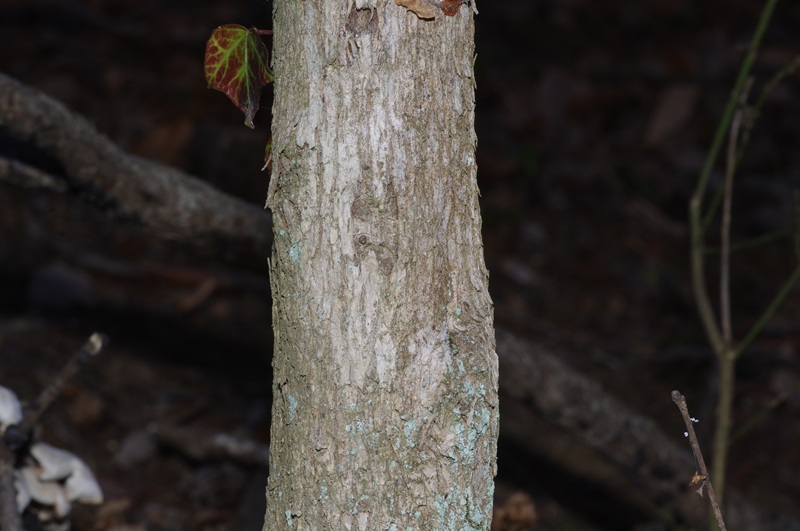 - 直径5〜6pほどと細めながらも、樹皮には地衣類やコケ類がつき、かなり樹齢がいっているのだろうなあ、という感じがするサワフタギの幹(写真)。樹皮には亀裂が入っており、カキノキによく似ています。公園内では標柱4〜5番にかけて数本が見られるだけなので、近くを通るときにはついつい気にしてみてしまう…そんな存在です。5月の連休のころに白い清楚な花を咲かせます。
