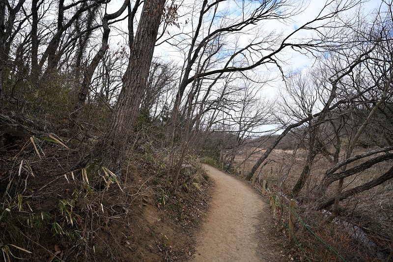 - 標柱5〜6番間の雑木林沿い(写真)では、ヒメカンスゲの蕾が目にとまるようになりました。もう少しすれば、黄色いブラシのような雄花が咲きます。また、標柱12番ではオニシバリの蕾も大きくなってきました。こちらは黄緑色の小さな花をひっそりと咲かせます。