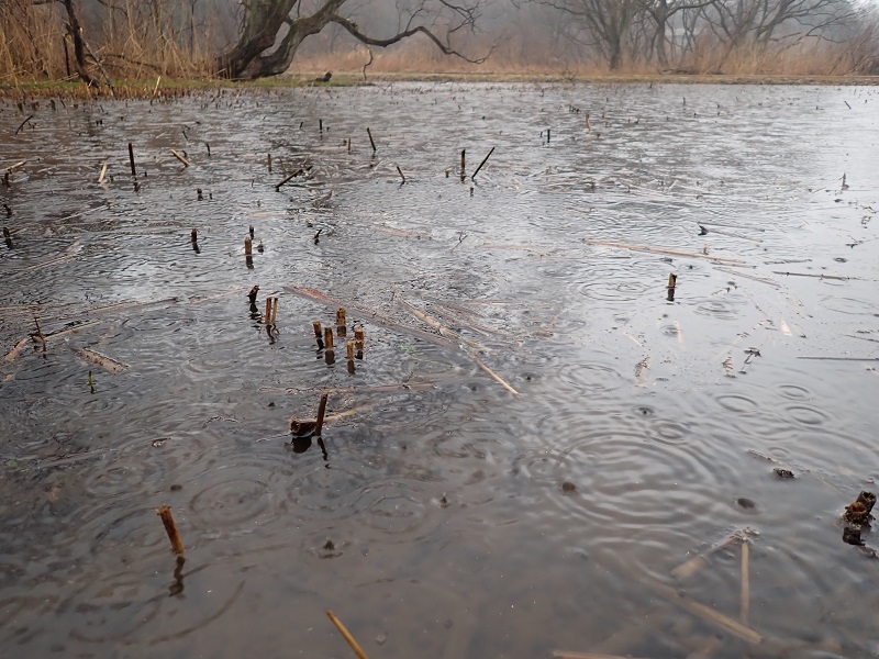 - 冷たい花散らしの雨(写真)。雨音に包まれる中、耳をすませると高尾の池から「ピリッ、ピリッ」「グェー! グェッ グェッ」とコガモやマガモの声が聞こえて来ました。カモたちの中には1羽のカイツブリ。ゆったり泳いだり、時々羽をぶるっと震わせて水滴を払ったりしていました。