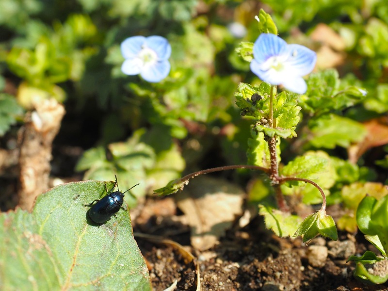 - 枯れ野に少しずつ増えゆく色。標柱16番の草はら奥のウグイスカグラが、5輪開花しました! この薄紅色を見ると、今年も春がやってきたんだなあ、と感じます。写真は、南口近くで出会ったコガタルリハムシとオオイヌノフグリの青の競演です。すぐ隣にはコルリアトキリゴミムシもいました。