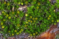 - 朝まで降り続いた雨に濡れて、ひときわ緑鮮やかに見えたのはタチヒダゴケ(写真)。標柱3番付近の樹林内にある倒木の上に生えていました。丸い形をした凵iさく:胞子をつくる器官)にひだがあるのが特徴です。
