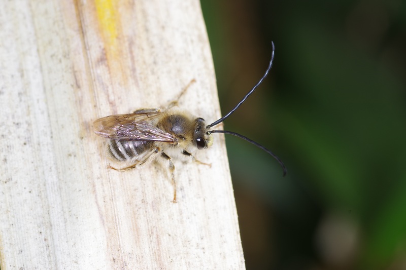 - 朝、まだ気温が低かったためか、シロスジヒゲナガハナバチ(写真)が枯葉の上で翅を休めていました。よく似た種類にニッポンヒゲナガハナバチがいますが、いずれも、触角が長く「ヒゲナガ」なのはオスだけです。センター前の草地では、この2種類が盛んにヤハズエンドウの花を訪れていました。