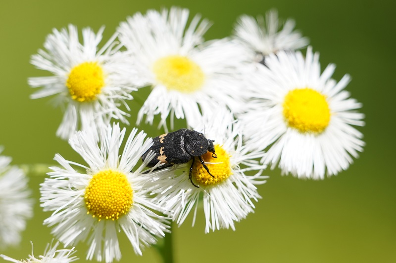 - 夏を感じる青空と日差し。標柱16番の草地では、シオカラトンボやヒメウラナミジャノメなど、初夏らしい昆虫たちがふえてきました。その中で特に目ついたのはクロハナムグリ(写真)。ハルジオンの花の上で花粉を食べており、周囲を見回すだけで10匹以上が視界に入るほど。例年だとコアオハナムグリの方が数が多いのですが、なぜか今シーズンは逆転しているようです。